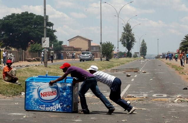 Locals push a freezer after looting it from a shop, believed to be owned by a foreigner, during service delivery protests in Mohlakeng, west of Johannesburg, February 4, 2015. Local media reported that violence broke out on Wednesday morning when locals barricaded roads and burnt tyres during a service delivery protest. (Photo by Siphiwe Sibeko/Reuters)
