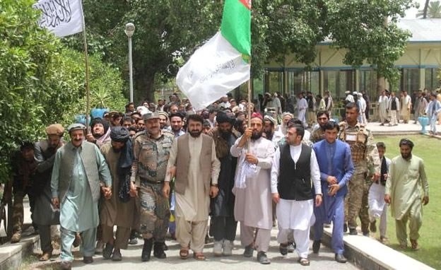 He led a joint procession of government and Taliban members through the eastern city of Jalalabad - the red, green and black national flag, along with the white banner of the insurgents, fluttering above them.