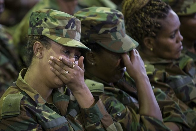 Members of the military shed a tear during a state ceremony for assassinated army chief Gen. Seare Mekonne, at the Millennium Hall in the capital Addis Abab, Ethiopia Tuesday, Jue 25, 2019.