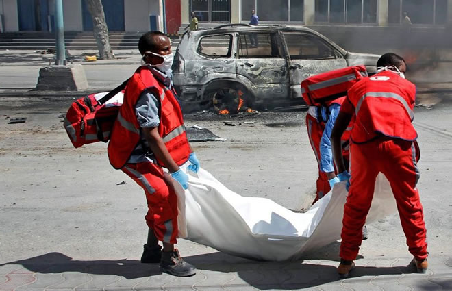 Medics carry away the body of a civilian who was killed when an explosive device planted in his car detonated, in Mogadishu, Somalia Tuesday, March 26, 2019. A Somali police officer says the bomb exploded killing the driver and injuring a nearby pedestrian in the Hodan district of the capital. (FARAH ABDI WARSAMEH / AP PHOTO)