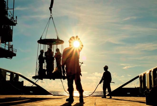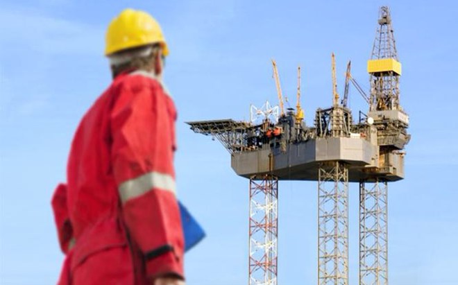 An oil worker passes the waste gas venting pipes on the Casablanca oil platform, operated by Repsol SA, in the Mediterranean Sea off the coast of Tarragona, Spain, June 28, 2016.