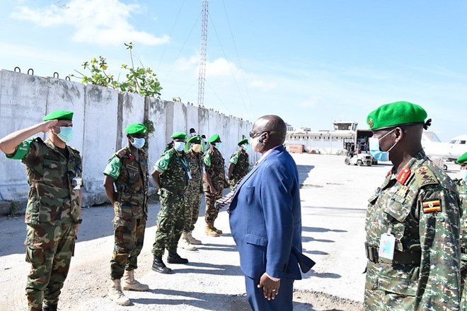 Gen. Ndegeya, was received at the Aden Abdulle International Airport by AMISOM Deputy Force Commander Operations and Plans, Major General Nakibus Lakara; Major Gen. George Owinow, the AMISOM Deputy Force Commander in charge Support and Logistics, and other senior AMISOM military officers.“I have come to help Africa, to help Somalia, to help our brothers. I have previously been here a number of times, from 2007 to 2012,” said Gen. Ndegeya in his brief remarks a few minutes after arrival.