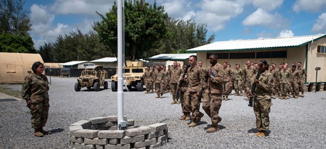 In this photo taken Aug. 26, 2019 and released by the U.S. Air Force, airmen from the 475th Expeditionary Air Base Squadron conduct a flag-raising ceremony, signifying the change from tactical to enduring operations, at Camp Simba, Manda Bay, Kenya. STAFF SGT. LEXIE WEST/U.S. AIR FORCE VIA AP