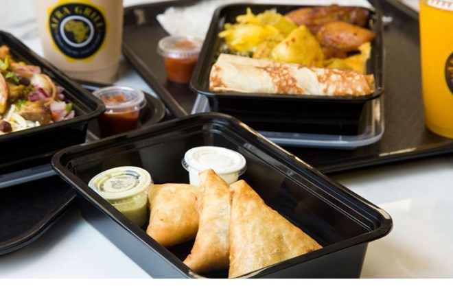 Rocking a tagline of “African inspired, American made,” Afra Grill — a fast-casual business with a drive-through window and amiable counter service — has premiered in one of the more attention-grabbing new restaurant settings I’ve seen this year.