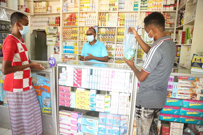 Good hand-washing practices to help stop the spread of COVID-19. Shown here, customers purchase hand sanitizers at a pharmacy in Jowhar, in Somalia’s Hirshabelle state. The pharmacy now sells an average of 60 hand sanitizers a day – a significant increase to previous sales of the same product before the COVID-19 pandemic reached Somalia.