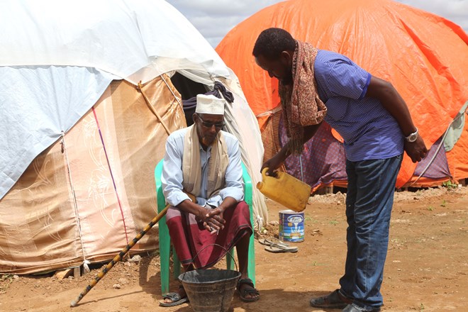 The pandemic has a disproportionate impact on vulnerable groups such as persons with disabilities, internally displaced people (IDPs), the elderly, and the poor. For some, the simple preventive measures against COVID-19 can be a challenging task in and of themselves. Shown here, Mohamed Sheikh Hassan, who lives in Haliye camp for IDPs in Belet Weyne, Hirshabelle state of Somalia, washes his hands. “In this camp, we have limited access to water and sanitation services, but I have been carefully following the advice of health officials. Through the radio, I have learnt that regular washing of hands with soap can help to protect my family and myself against the virus,” says Mohamed.
