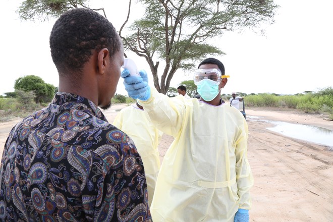 Somalia’s federal and regional authorities, in conjunction with various organizations, have undertaken a wide range of measures to combat COVID-19’s spread. These measures include putting in place water points across Dhobley town, in Somalia’s Jubaland state, for visitors and locals to wash their hands with soap as well as – shown here – screening travelers along the busy transit route connecting Somalia to Kenya in order to detect any carriers of the virus.