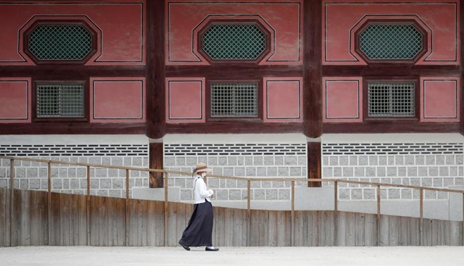 A woman wearing a face mask walks outside of Heungnyemun gate of the 14th-century Gyeongbok Palace, and one of South Korea’s well-known landmarks, in Seoul, South Korea, Friday, June 19, 2020. (AP Photo/Lee Jin-man)