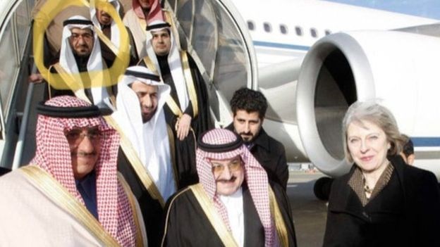 Saad al-Jabri (circled) was welcomed by then UK Home Secretary Theresa May (right) during a visit to London in 2015/BANDAR AL-GALOUD