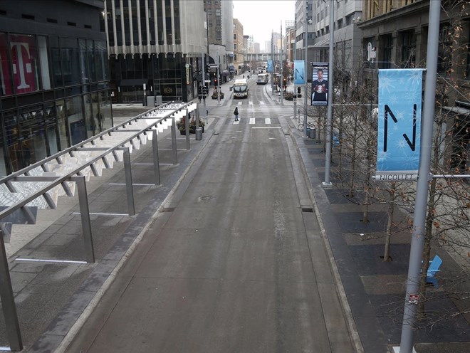 The popular Nicollet Mall during the lunch hour is almost deserted in downtown Minneapolis Wednesday. As a result of the coronavirus, many retailers are closing or cutting back hours. For most people, the new coronavirus causes only mild or moderate symptoms. For some, it can cause more severe illness. Jim Mone | AP Photo