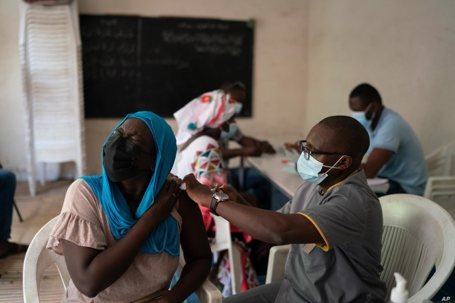A health worker administers a Johnson & Johnson COVID-19 vaccine dose in Dakar's Medina neighbourhood, Senegal, July 28, 2021.