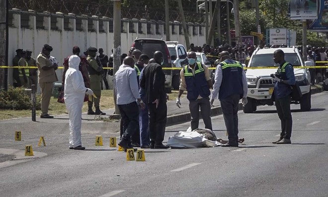 In this image made from video, security forces, forensic experts and onlookers gather near a body in the street near the French embassy in Dar es Salaam, Tanzania Wednesday, Aug. 25, 2021. Tanzania's president said five people are dead, including three police officers, after a gun battle with an armed man near the French Embassy in Dar es Salaam.AP
