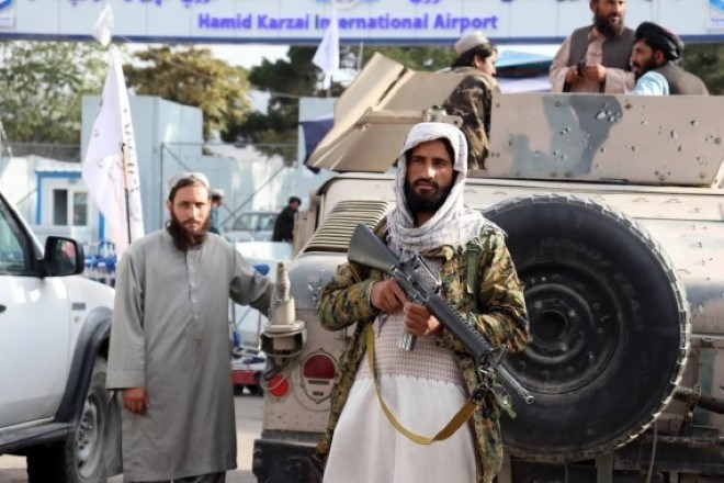 Taliban fighters stand guard in front of the Hamid Karzai International Airport after the US withdrawal in Kabul [Khwaja Tawfiq Sediqi/AP]