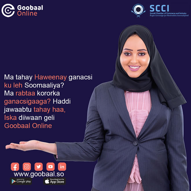 Haddii aad tahay Haweeney Soomaaliyeed oo ganacsi leh, oo aadna dooneyso in Goobaal Online uu ganacsigaaga gaarsiiso heerka ku xiga kan aad hadda joogto, booqo, https://www.goobaal.so/. Halkaan ka daawo sharaxaad faahfaahsan; https://www.youtube.com/watch?v=4lnud8bLHQ8