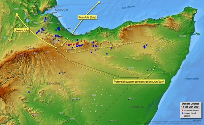 Nevertheless, new swarms that form during June and July are expected to move west to the Afar region in northeast Ethiopia where above-normal summer rains are predicted that would allow one generation of breeding from August to October.