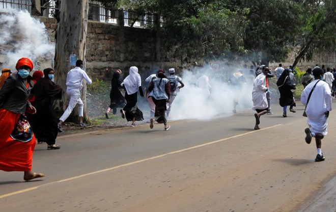 Pro-Palestinian demonstrators run past tear gas lobbed by riot policemen to disperse them during a protest following a flare-up of Israeli-Palestinian violence, in Nairobi, Kenya May 13, 2021. REUTERS/Monicah Mwangi