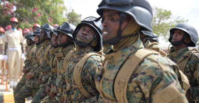 Somali National Army soldiers march during the 57th Anniversary of the Somali National Army held at the Ministry of defence in Mogadishu on April 12, 2017. Image: Ilyas Ahmed/AMISOM