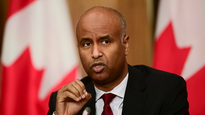 Minister of Families, Children and Social Development Ahmed Hussen takes part in an update on the COVID pandemic during a press conference in Ottawa on Tuesday, Oct. 27, 2020. (THE CANADIAN PRESS/Sean Kilpatrick)