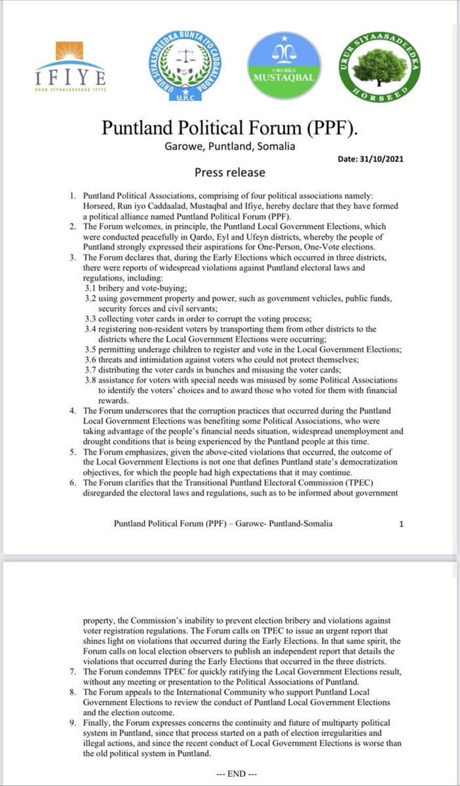 The four associations under the Puntland Political Forum umbrella raised several concerns regarding the district council elections in Qardho, Ufeyn and Eyl districts.