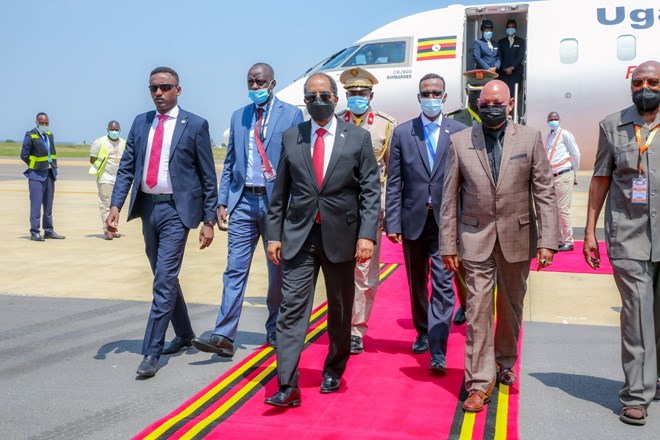 Meantime, President Mohamud was received at Entebbe Airport by foreign affairs minister Gen Jeje Odongo and the Minister of Defence and Veteran Affairs Vincent Ssempijja as well as trade minister Francis.