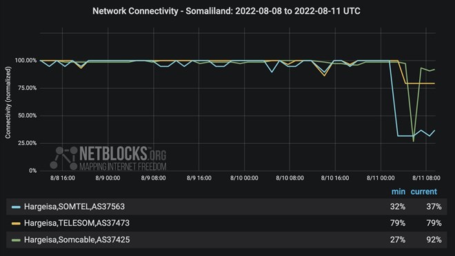 "Real-time network data show the disruption coming into effect on mobile and fixed-line internet providers supplying Somaliland by Thursday morning, corroborating user reports of outages in multiple cities in the autonomous region which lies north of Somalia."