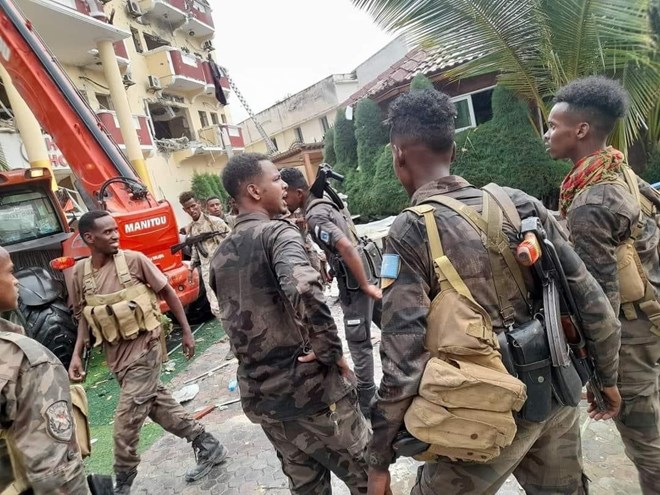 Soldiers on Saturday outside the Hayat Hotel in Mogadishu, Somalia. (SONNA)