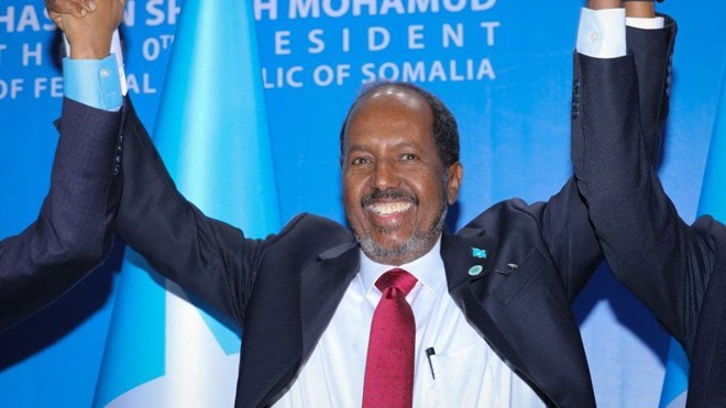 Somalia's new President Hassan Sheikh Mohamud reacts during his inauguration/ AFP