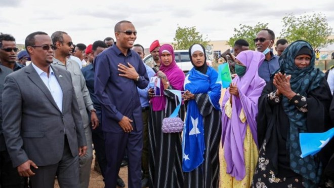 Somali Prime Minister Hamza Abdi Barre is on December 14, 2022 received by residents of Adan Yabal, a town in Middle Shabelle region which was recently liberated from the grip of Al-Shabaab militants. PHOTO | ABDULKADIR KHALIF | NMG