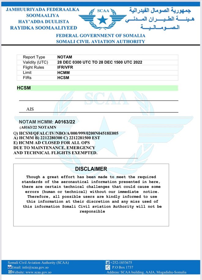 According to a statement by the Somali Civil Aviation Authority (SCAA), civilian flight operations at Aden Adde airport have been suspended. The reason cited was "maintenance." Emergency and technical flights are exempt from the travel ban.
