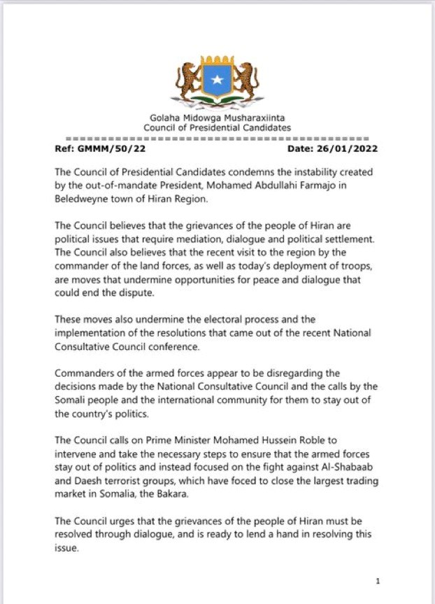 “The council of presidential candidates condemns the instability created by the out-of-mandate President, Mohamed Abdullahi Farmajo.”