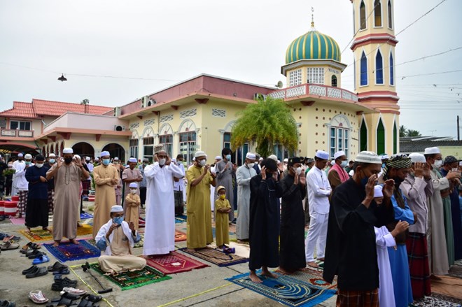 Thai Muslims gather to pray at a mosque during the Islamic Eid al-Adha festival in the southern province of Narathiwat. [Madaree Tohlala/AFP]