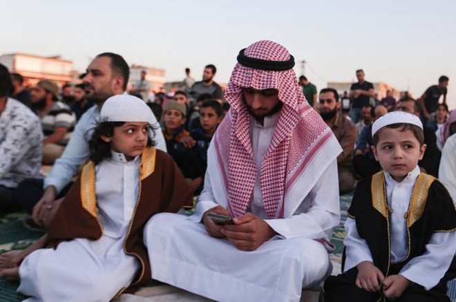 Muslims gather to perform the morning prayer on the first day Eid al-Adha holiday, in Bab al-Hawa near the border with Turkey, in Syria's northwestern Idlib province. [Aaref Watad/AFP]