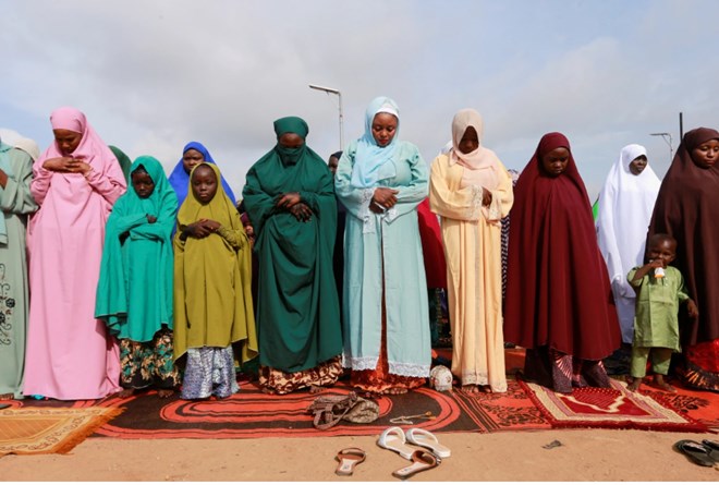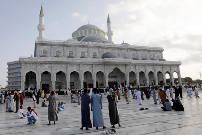 Muslims are seen after the prayers during the Eid al-Adha celebrations at the newly built Ali Jim'ale Mosque in Mogadishu, Somalia. [Feisal Omar/Reuters]