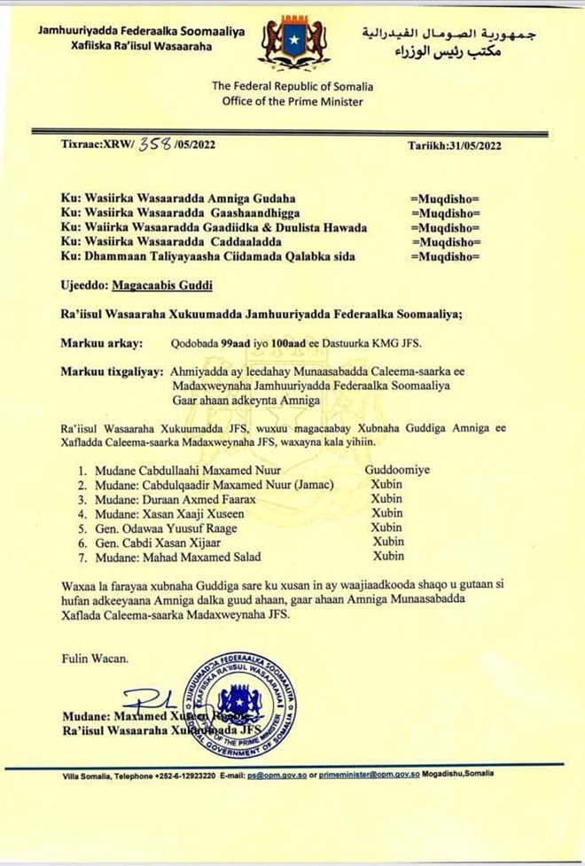 Mogadishu (HOL) - Prime Minister Mohamed Hussein Rooble has appointed the security committee for the inauguration ceremony of the Somali president, which is scheduled to take place on June 9.