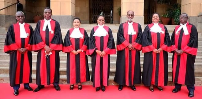 Chief Justice and President of the Supreme Court Martha Koome (centre) and Deputy Chief Justice and Vice-President of the Supreme Court Philomena Mwilu (third left) with Supreme Court Judges (from left) Isaac Lenaola, Dr Smokin Wanjala, Mohamed Ibrahim, Njoki Ndung’u and William Ouko at the Supreme Court Building in Nairobi. Jeff Angote | Nation Media Group