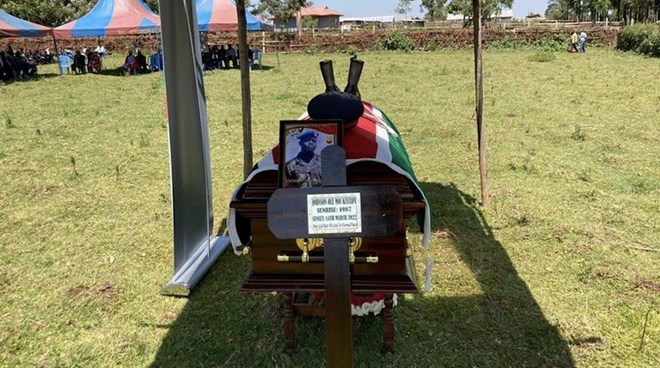 The coffin was draped with the Kenyan flag and on top of it were placed his military cap, belt and boots.