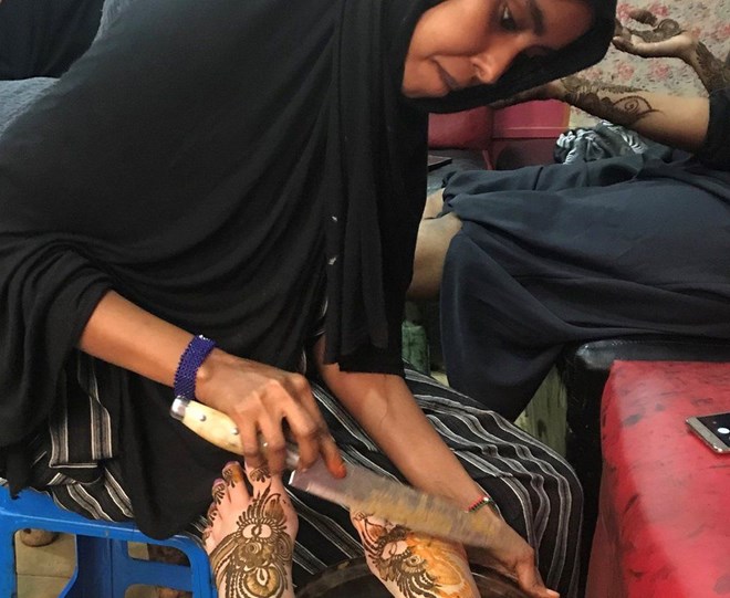 Carving knives are used in some beauty parlours to scrape dried henna paste off legs, arms and hands, revealing delicate, dainty patterns on the skin that slowly fade away with time.