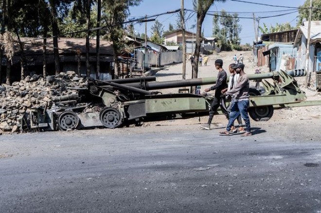 People walk past a destroyed heavy artillery equipment in Hayk, Ethiopia, on Dec. 13, 2021.Photographer: Amanuel Sileshi/AFP/Getty Images