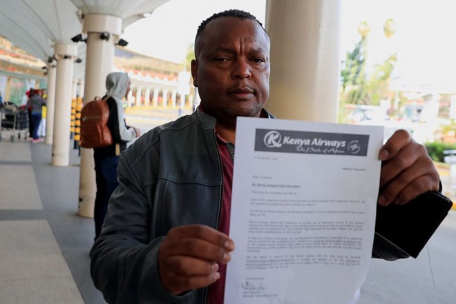 Lawrence Ndibo, a passenger displays his flight cancellation letter issued by Kenya Airways during a strike by Kenya Airways pilots, organised by Kenya Airline Pilots Association (KALPA), at the Jomo Kenyatta International airport in Nairobi, Kenya November 5, 2022. REUTERS/Thomas Mukoya