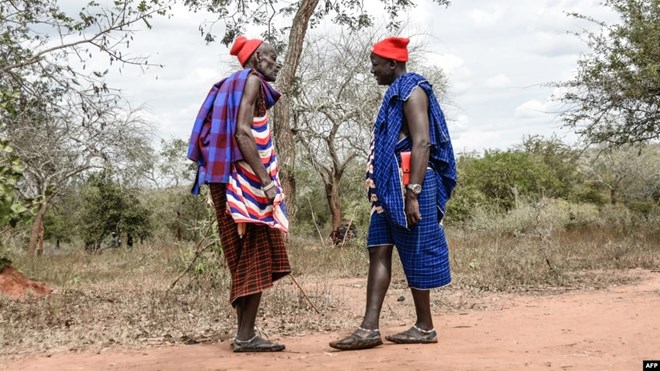 FILE - Maasai men converse at the Msomera village in Handeni, Tanzania, July 15, 2022. Tanzanian authorities have started rationing electricity because of a drop in hydropower generation brought on by drought, the national provider said Nov. 23, 2022.