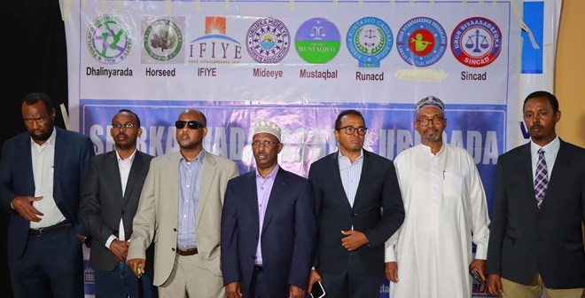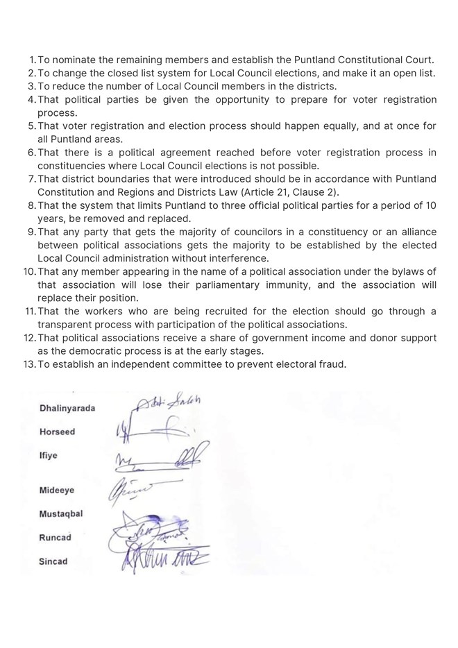 Seven parties - Dhalinyarada, Horseed, Ifiye, Mideeye, Mustaqbal, Runcad, and Sincad - signed a joint communique following an election meeting in the regional capital."The political associations of Puntland have agreed that they are ready to participate in the elections that are free and fair. The registered political associations have emphasized and agreed on the important points below to be implemented before voter registration and election process for Local Counsils is started in Puntland."