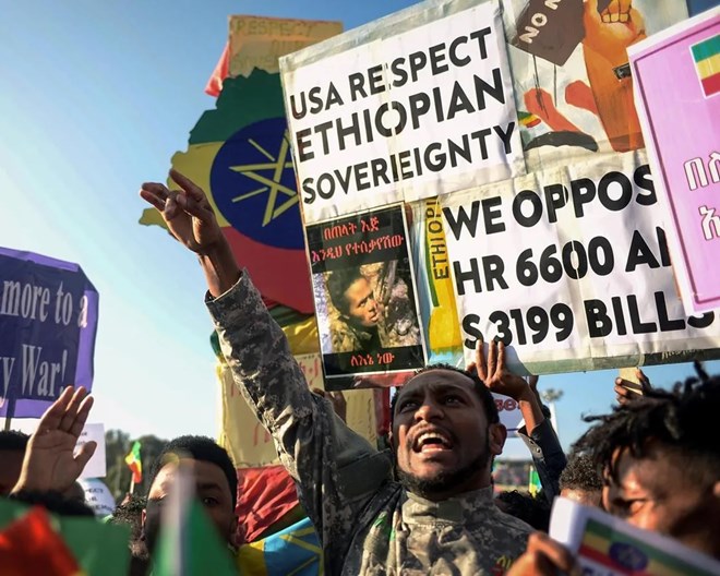 Some demonstrators displayed banners accusing the U.S. of disrespecting Ethiopia's sovereignty, while others singled out Tigray's fugitive leaders for blame.