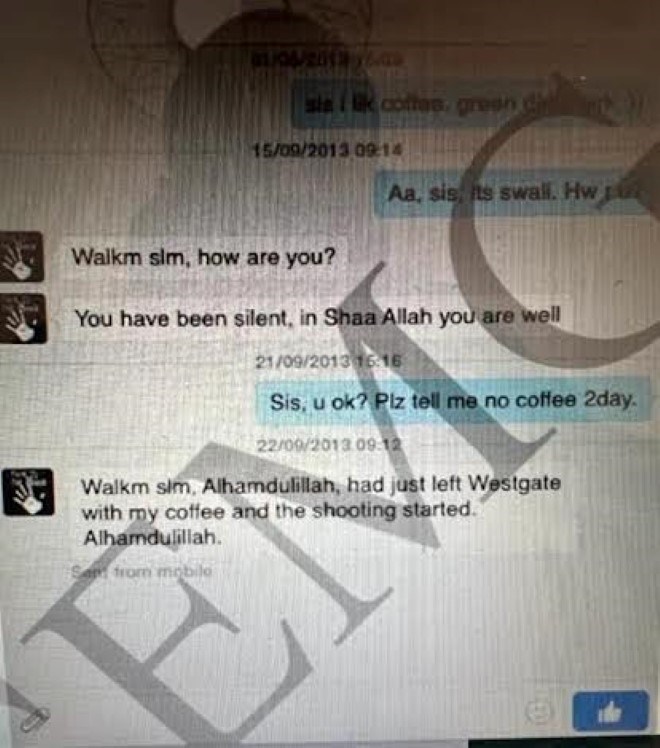 On the second day of the siege, at 9:12 am, "M" responded saying "Walkm slm, Alhamdulillah, had just left Westgate with my coffee and the shooting started. Alhamdulillah."