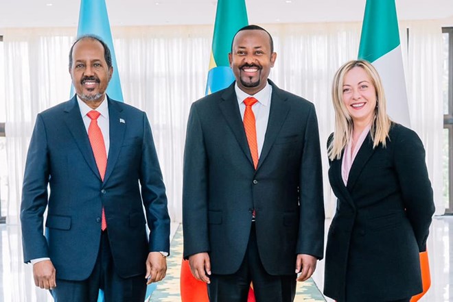 Mogadishu (HOL) - Somali President Hassan Sheikh Mohamed attended a tripartite meeting on Saturday with the Prime Minister of Italy, Giorgia Meloni, and the Prime Minister of Ethiopia, Abiy Ahmed, in Addis Ababa.