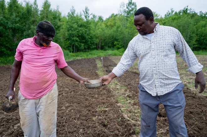 Muhidin Libah (right), the executive director for the Somali Bantu Community Association of Lewiston, hands Ahmed Baraki (left) seeds while planting corn at Liberation Farms in Wales, Maine.VINCENT ALBAN FOR THE BOSTON GLOBE