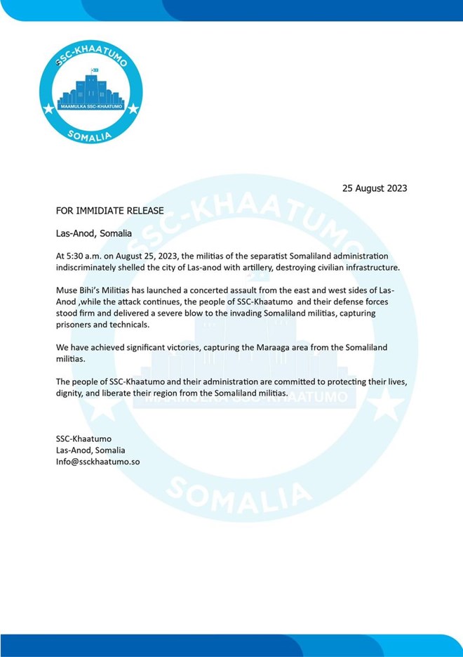 "Muse Bihi's army launched a concerted assault from the east and west sides of Las- Anod. Despite the ongoing attack, the people of SSC-Khaatumo and their defence forces stood firm and delivered a severe blow to the invading Somaliland militias, capturing prisoners and technical," the SCC said.Somaliland government has not responded to these claims of victory by the administration of Sool, Sanag, and Ayn, collectively known as SCC-Khatumo.