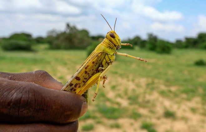 A farmer holds a desert locust in a grazing land on the outskirt of Daynile district of Mogadishu, Somalia Nov 13, 2020. [Photo/Agencies]