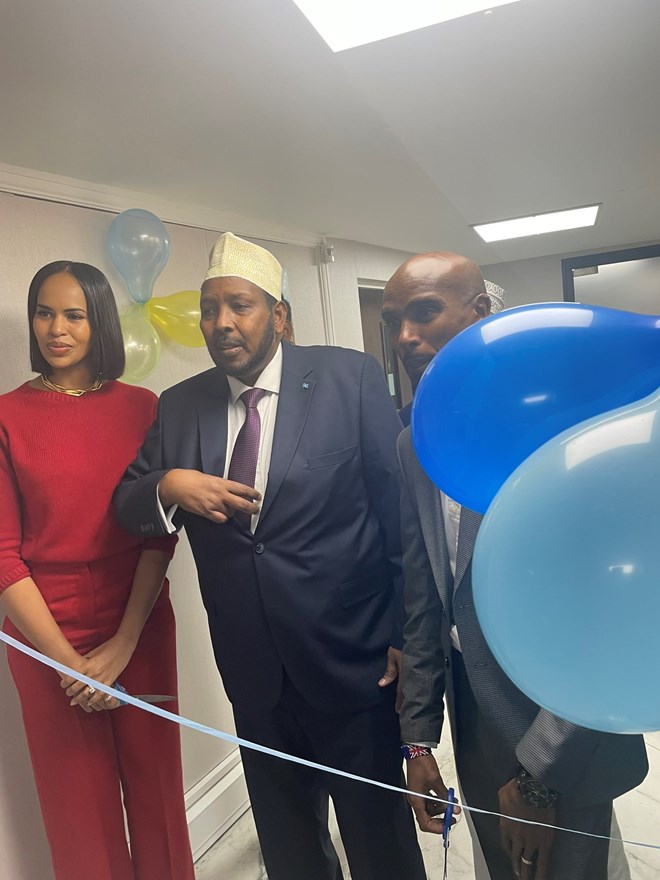 The ribbon-cutting ceremony was attended by Somali Ambassador to the United Kingdom Abdulkadir Ahmed Kheyr Abdi, as well as prominent Somali-Brits, including 4x Olympic champion Sir Mohamed Farah (Mo Farah and Anti-khat campaigner Abukar Awale.Close to two dozen Somali-Brits were on hand at the ceremony, which featured Somali-Canadian model and climate activist Sabrina Dhowre as a special guest.