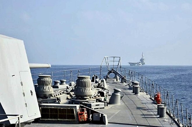 Courtesy of the Defense Ministry Joint Staff. MSDF destroyer Suzutsuki, foreground, is seen during a drill with French aircraft carrier Charles de Gaulle.
