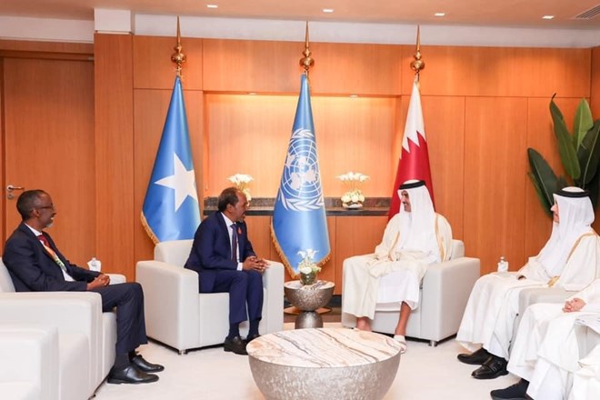 Mogadishu (HOL) - President Hassan Sheikh Mohamud met with Qatar's Emir Tamim Bin Hamad on the sidelines of the Fifth United Nations Conference on the Least Developed Countries (LDC5) in Doha. The leaders discussed both nations' bilateral relationship and mutual interests in promoting peace and development in the region while strengthening the long-standing ties between Somalia and Qatar.